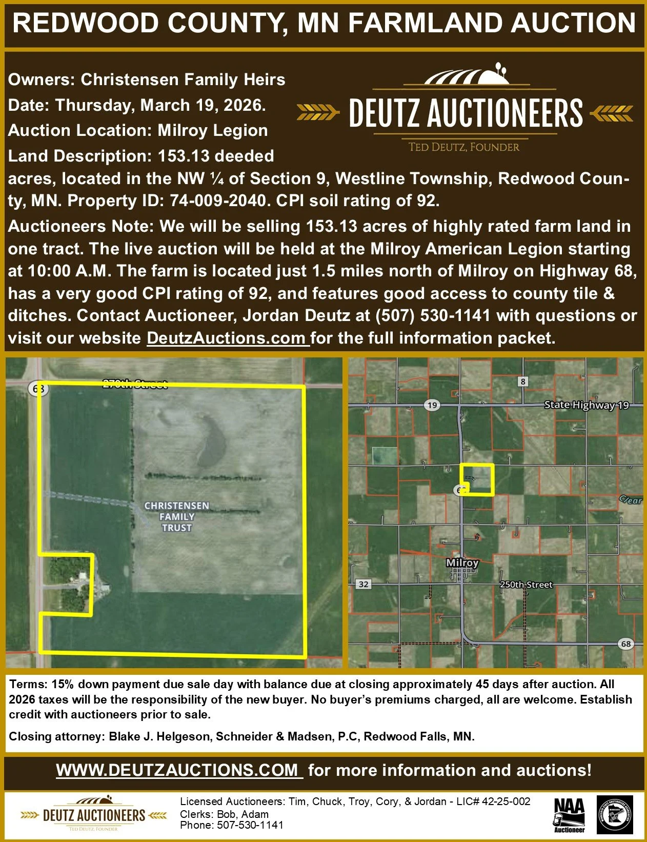 Auctioneers Note: We will be selling 153.13 acres of highly rated farm land in one tract. The live auction will be held at the Milroy American Legion starting at 10:00 A.M. The farm is located just 1.5 miles north of Milroy on Highway 68, has a very good CPI rating of 92, and features good access to county tile & ditches. Contact Auctioneer, Jordan Deutz at (507) 530-1141 with questions.