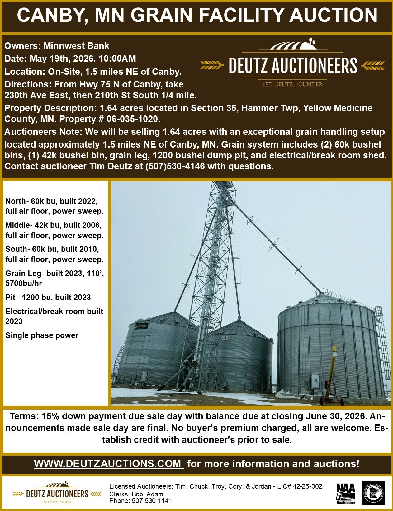 located approximately 1.5 miles NE of Canby, MN. Grain system includes (2) 60k bushel bins, (1) 42k bushel bin, grain leg, 1200 bushel dump pit, and electrical/break room shed. Contact auctioneer Tim Deutz at (507)530-4146 with questions.